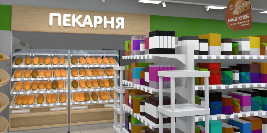 - продукцией собственного производства: хлебом, выпечкой, тортами и готовой едой в вакууме;