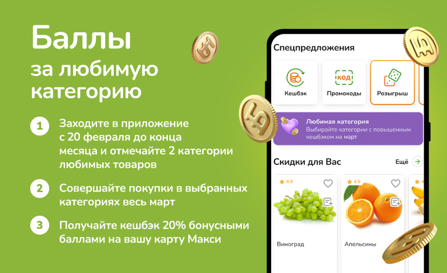 📌 Акция доступна владельцам белых карт, которые ранее уже совершили 4 покупки в Макси. Максимальная сумма баллов к получению – 1500 суммарно за обе выбранные категории.